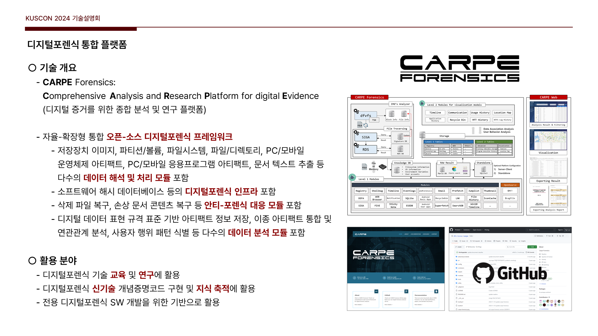 [디지털포렌식연구실] 디지털포렌식 통합 플랫폼 정보보호대학원 2024-07-30 정보보호대학원 이전 가능 기술 0 1895 2024.07.30 21:51 ○ 담당연구실 : 디지털포렌식연구실 (02-3290-4738, koreauniv.dfrc@gmail.com)