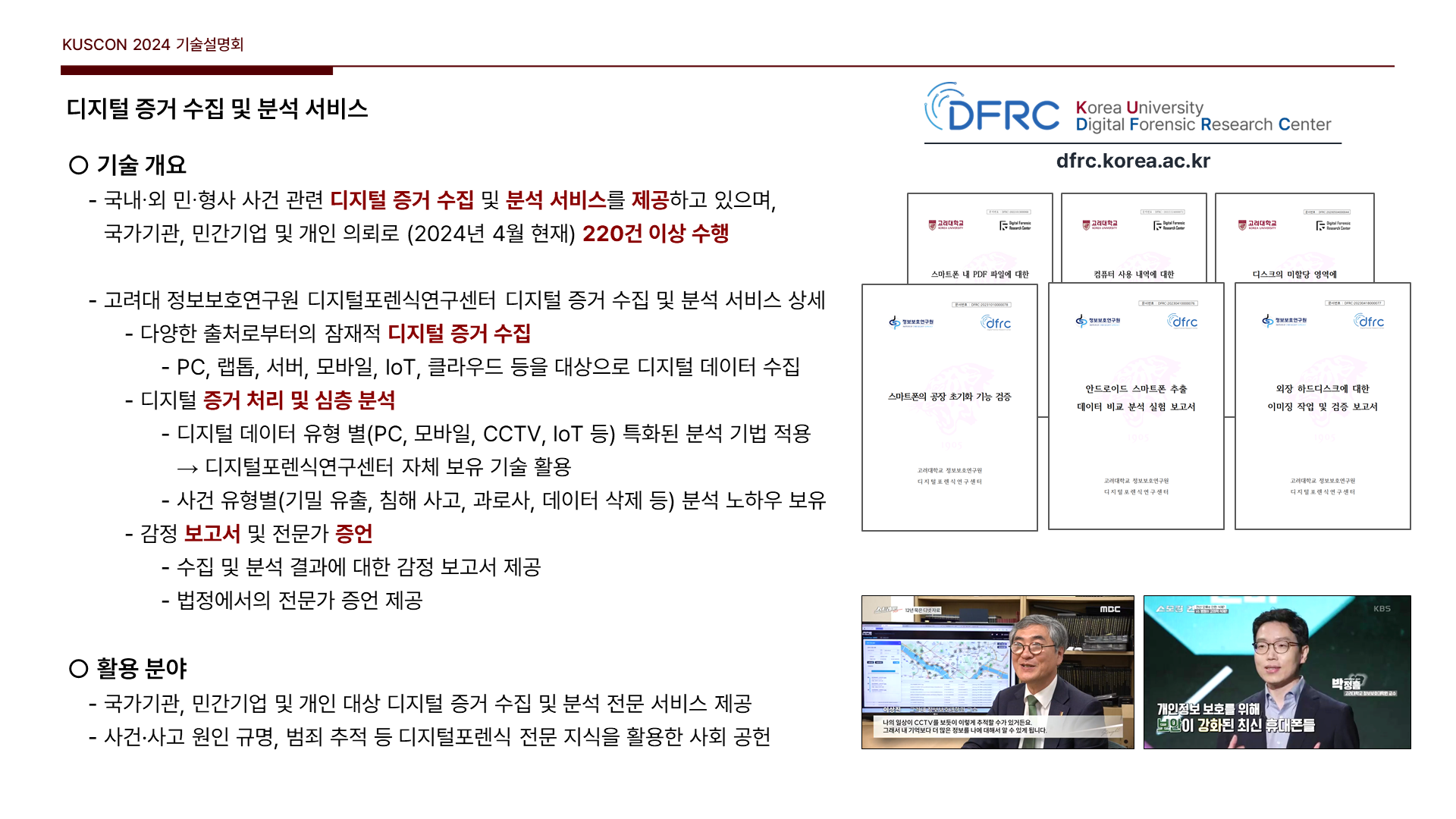 [디지털포렌식연구실] 디지털 증거 수집 및 분석 서비스 정보보호대학원 2024-07-30 정보보호대학원 이전 가능 기술 0 2282 2024.07.30 21:55 ○ 담당연구실 : 디지털포렌식연구실 (02-3290-4738, koreauniv.dfrc@gmail.com)