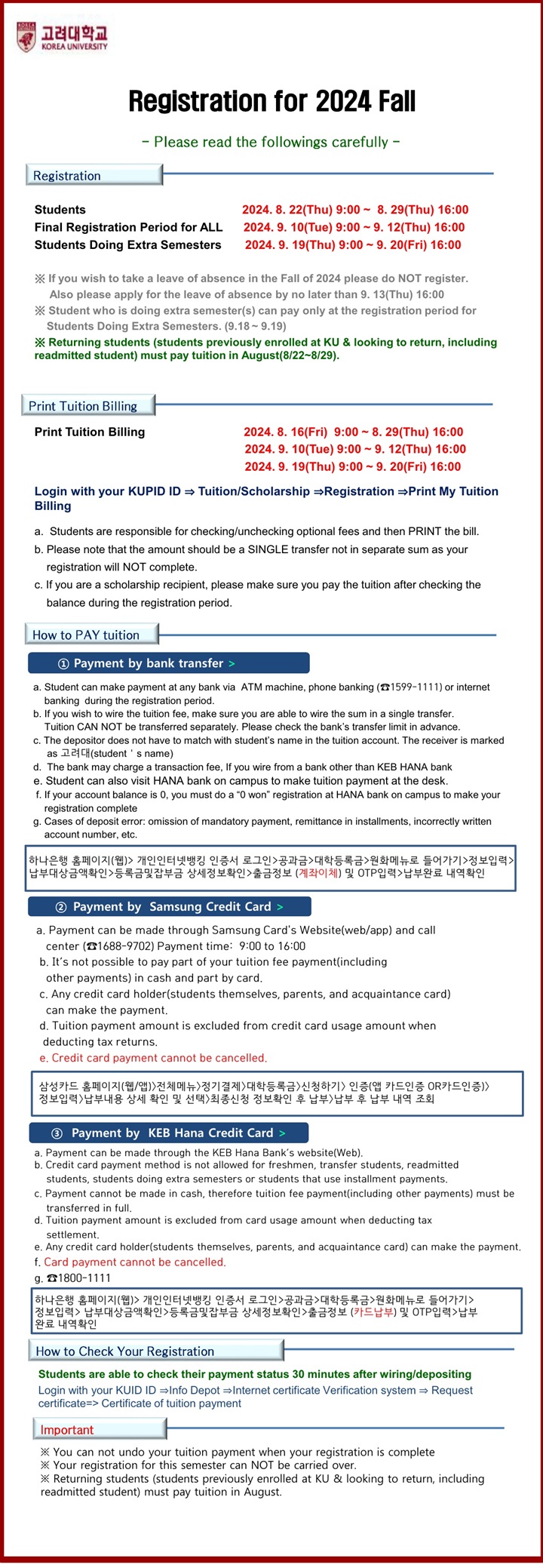 ※ 장학금 전액 수혜로 납부할 수업료가 "0원"인 경우에도 등록 기간 내 반드시 0원 등록을 해야 합니다.
