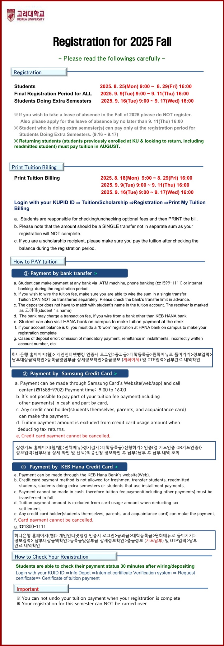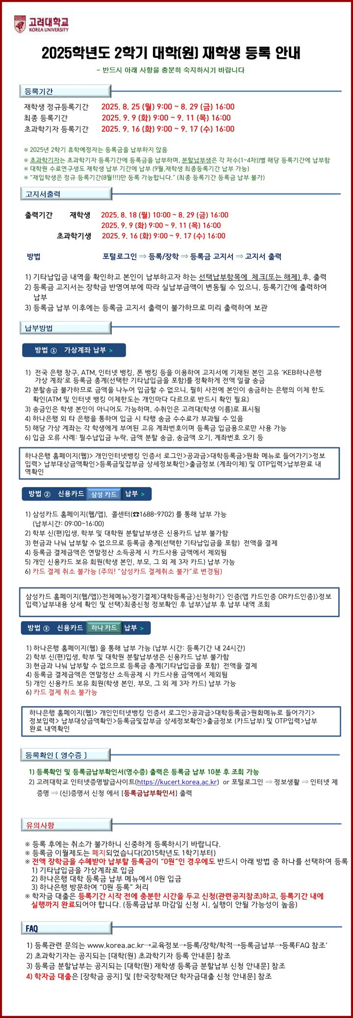 3. 재입학생 및 특례진입생은 정규 등록기간(8/25~8/29)에만 등록 가능합니다.