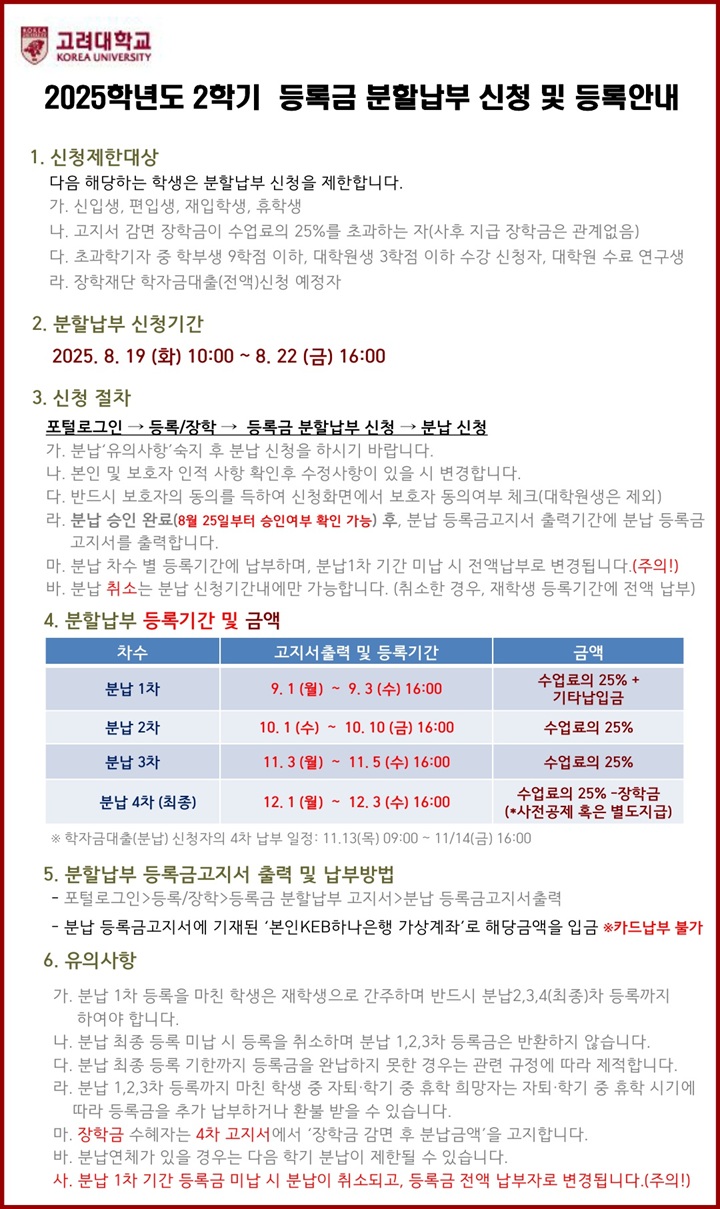 [재정팀] 2025년 2학기 대학(원) 등록금 분할납부 신청 및 등록 안내 스마트보안학부 2025-09-01 스마트보안학부 스마트보안학부 0 1965 2025.09.01 14:56 2025년 2학기 대학(원) 등록금 분할납부 신청 및 등록 안내드립니다.