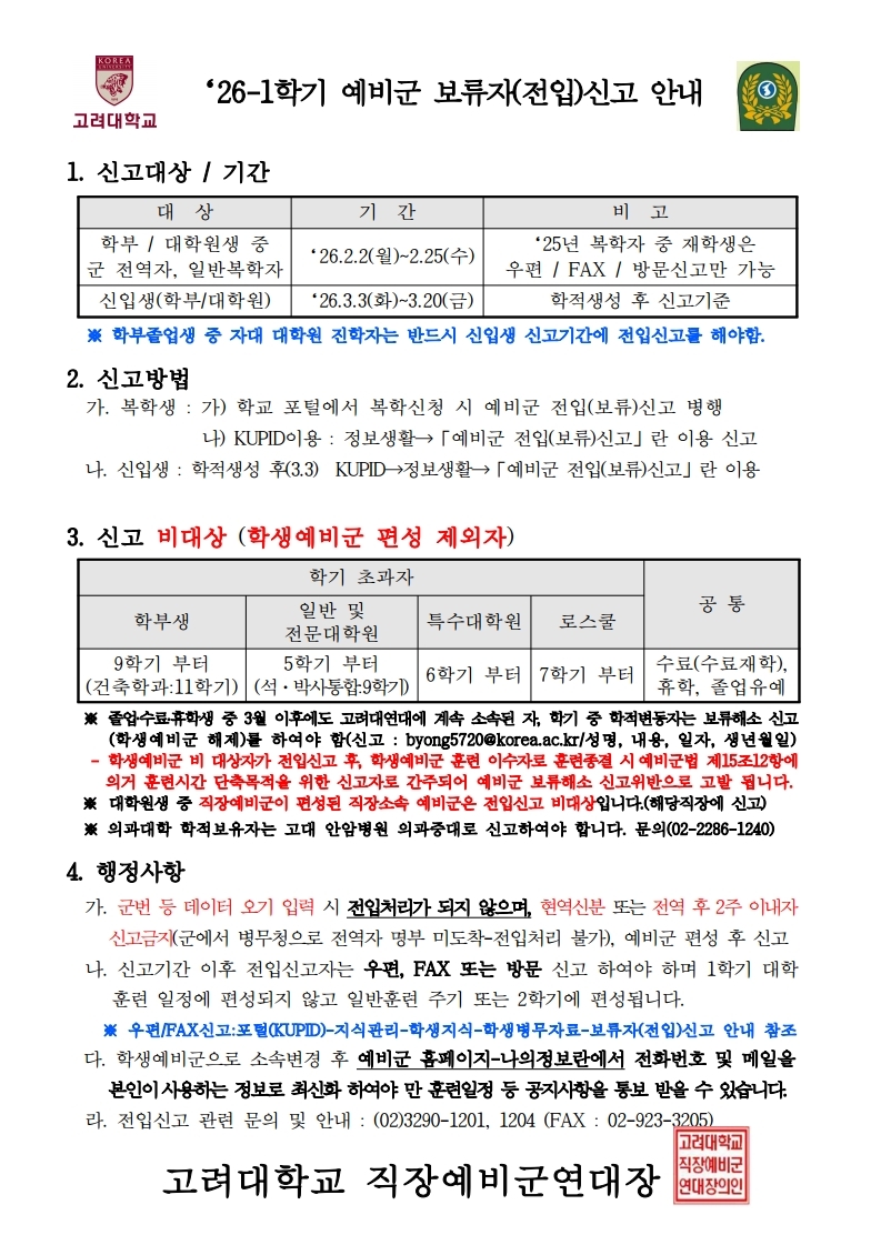 2026-1학기 학생예비군 보류자(전입) 신고 안내 스마트보안학부 2026-01-23 스마트보안학부 스마트보안학부 0 1244 01.23 11:04 2026.01.23 11:04 2026-1학기 학생예비군 보류자전입 신고 안내.pdf (86.8K) + 19 .