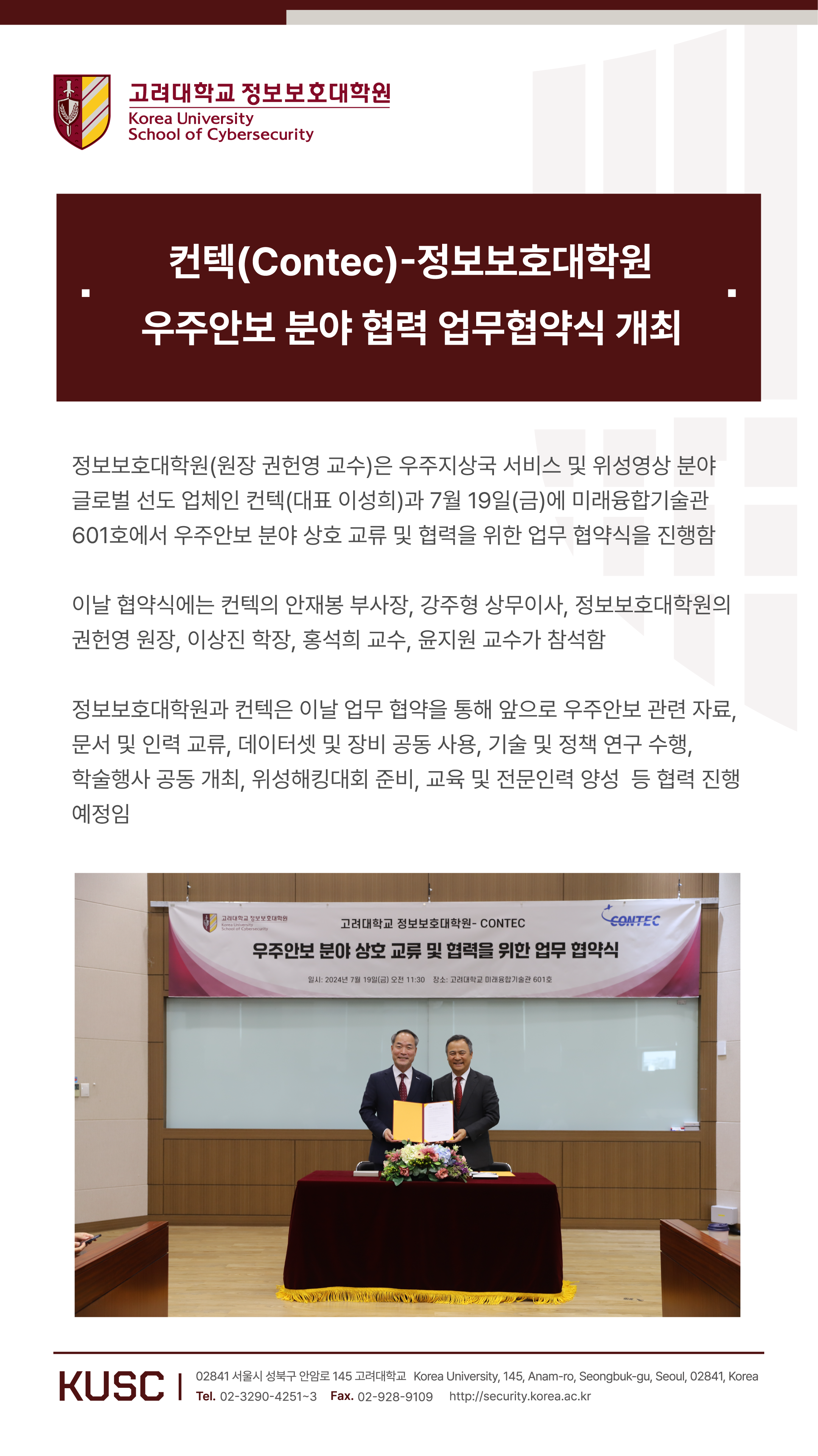 정보보호대학원-컨텍(Contec) 우주안보 분야 협력 업무협약식 개최