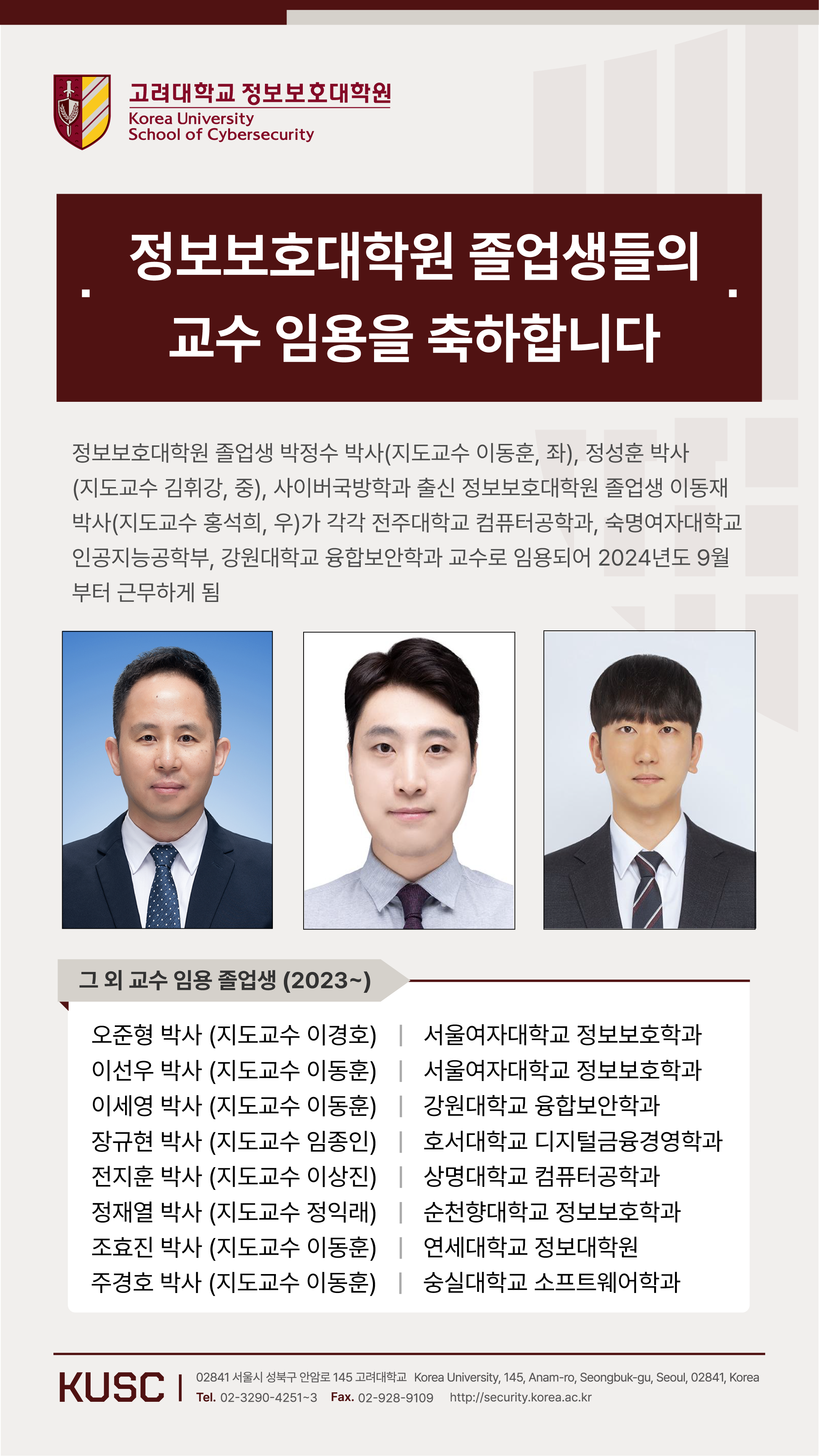 정보보호대학원 졸업생(박정수 박사, 정성훈 박사, 이동재 박사) 교수 임용