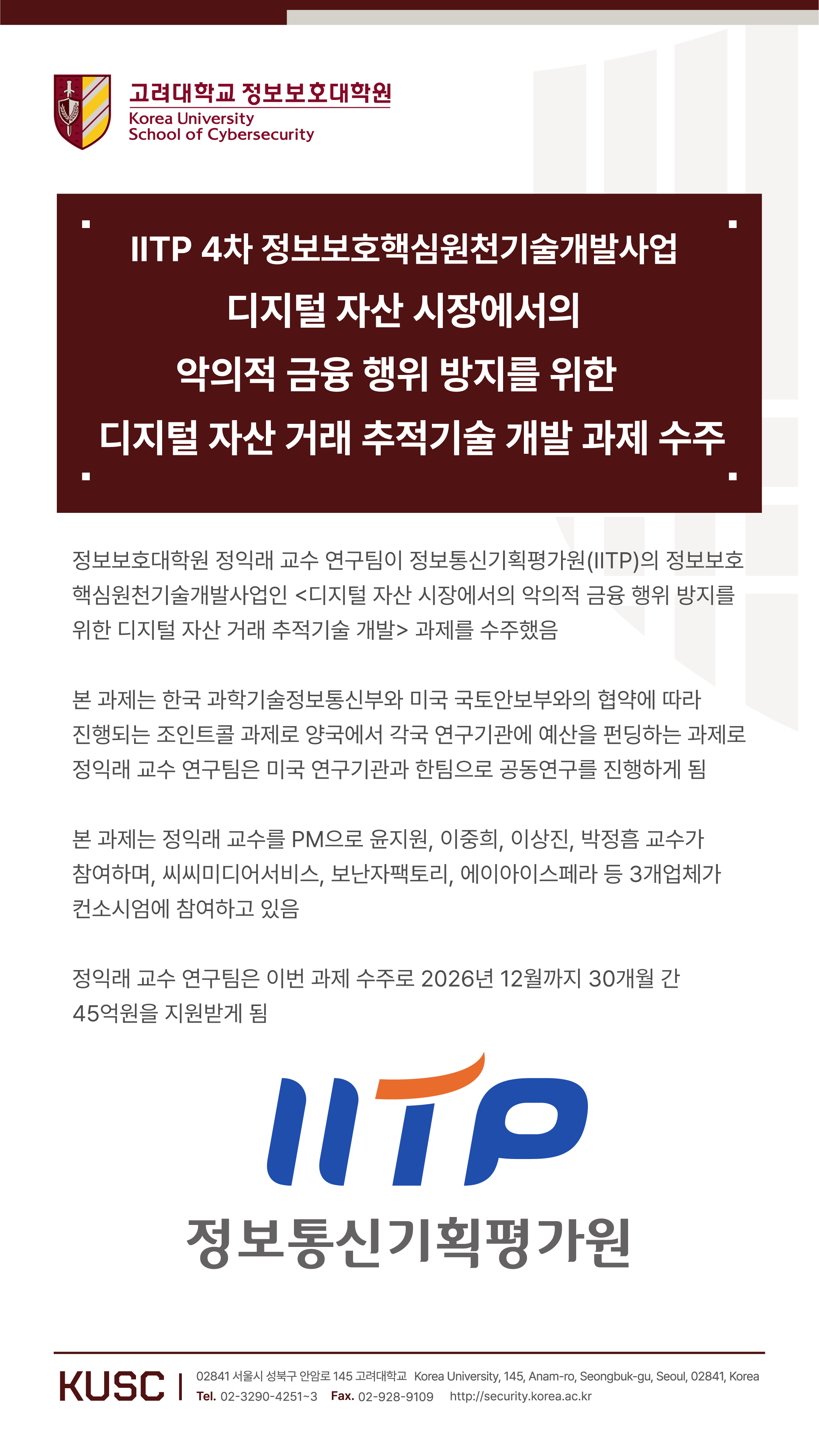 IITP 4차 정보보호핵심원천기술개발사업 수주 : 디지털 자산 시장에서의 악의적 금융 행위 방지를 위한 디지털 자산 거래 추적… 정보보호대학원 2024-08-05 정보보호대학원 실적소개 0 2456 2024.08.05 14:01