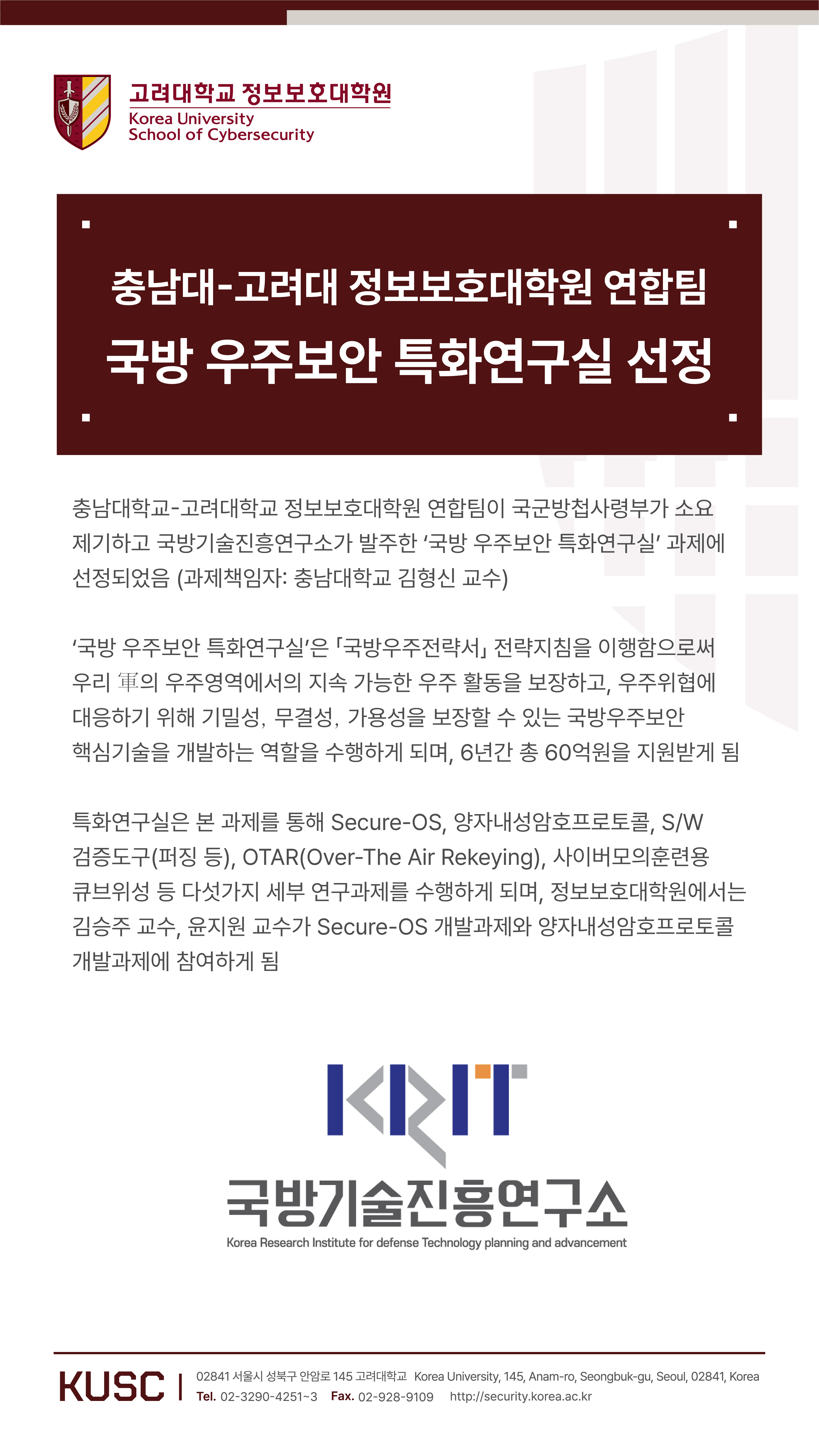 충남대-고려대 정보보호대학원 연합팀, 국방 우주보안 특화연구실 선정