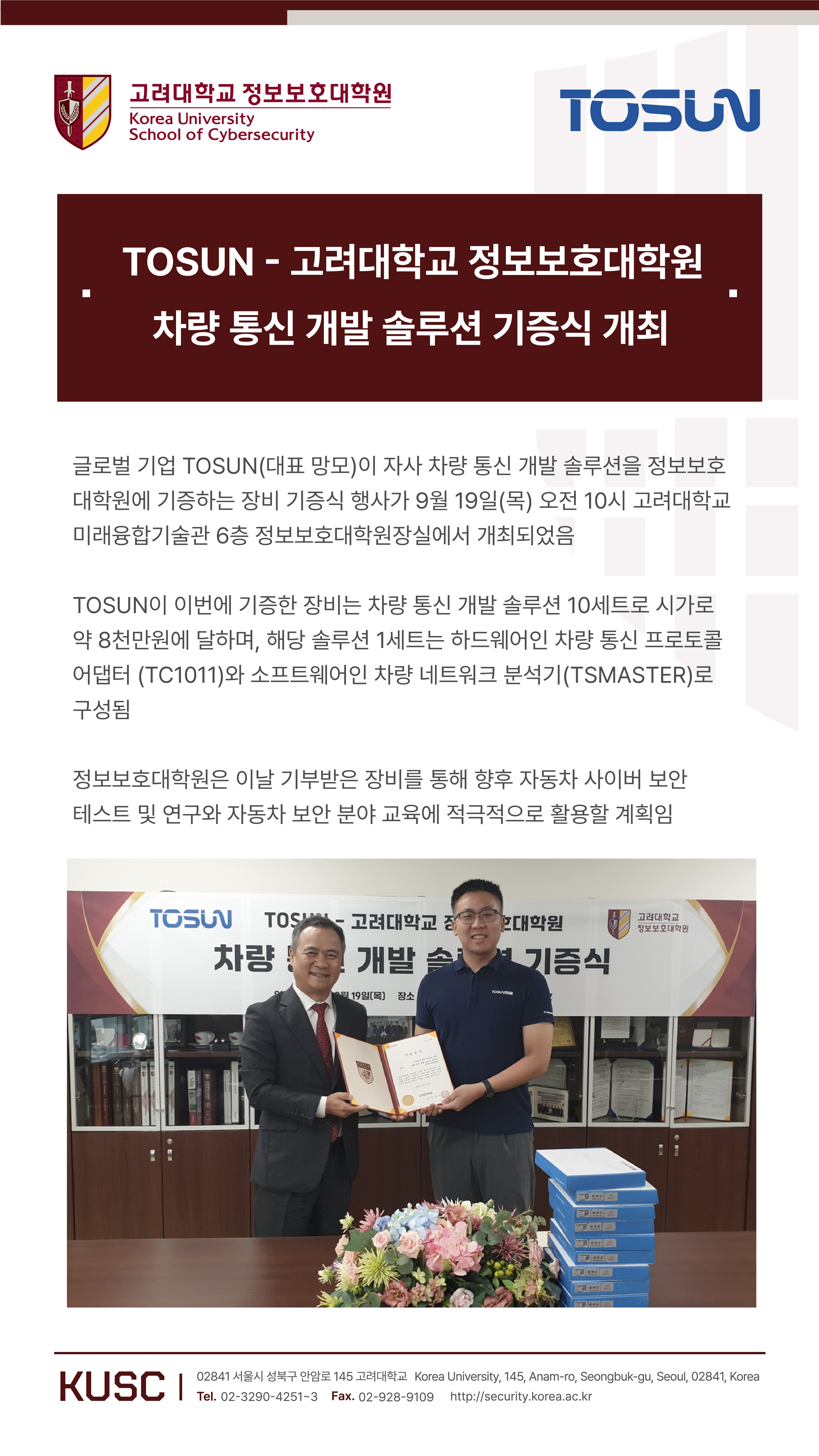TOSUN-정보보호대학원 차량 통신 개발 솔루션 기증식 개최 (9.19)