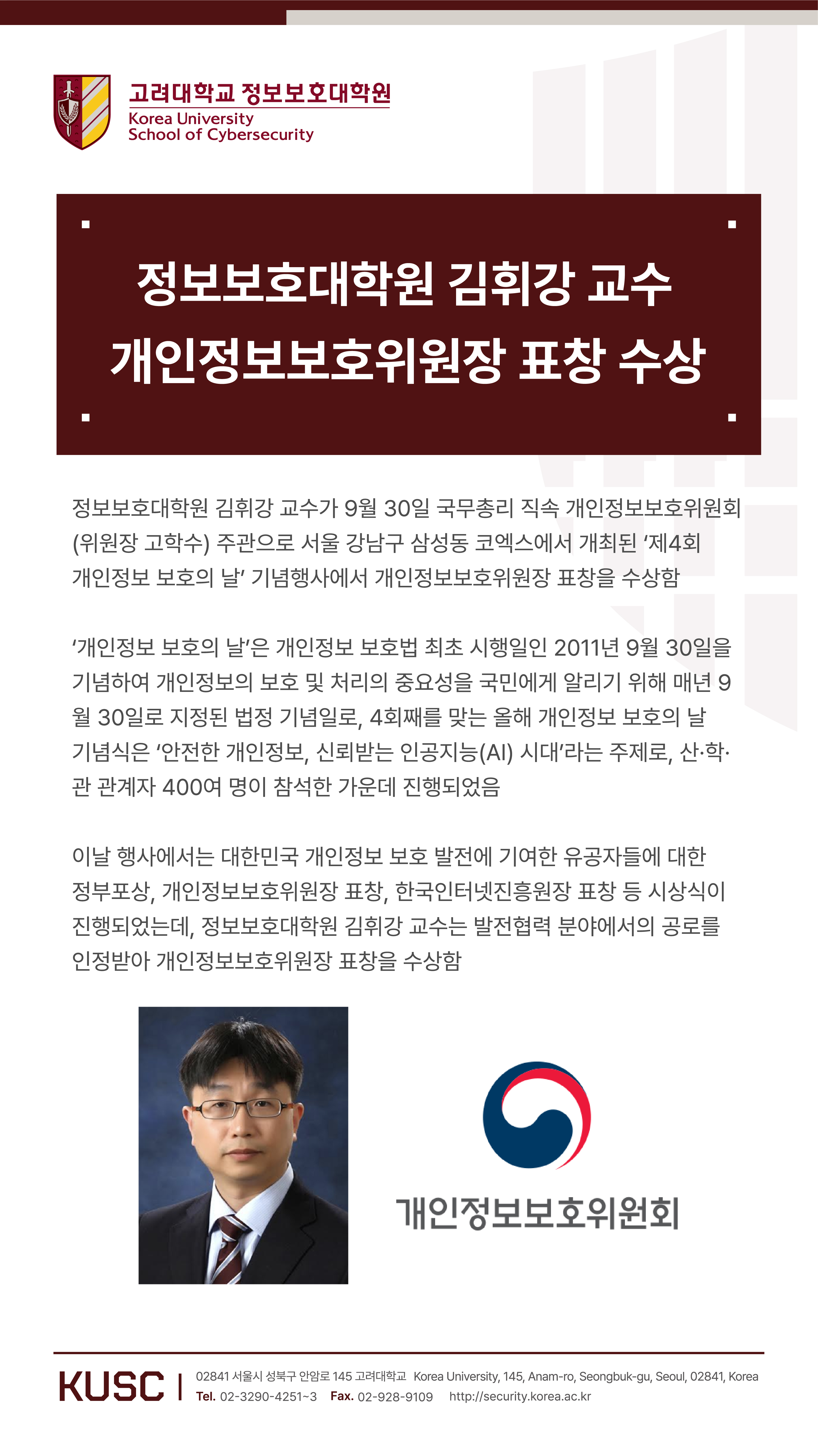 김휘강 교수, 제4회 개인정보보호의 날 개인정보보호위원장 표창 수상