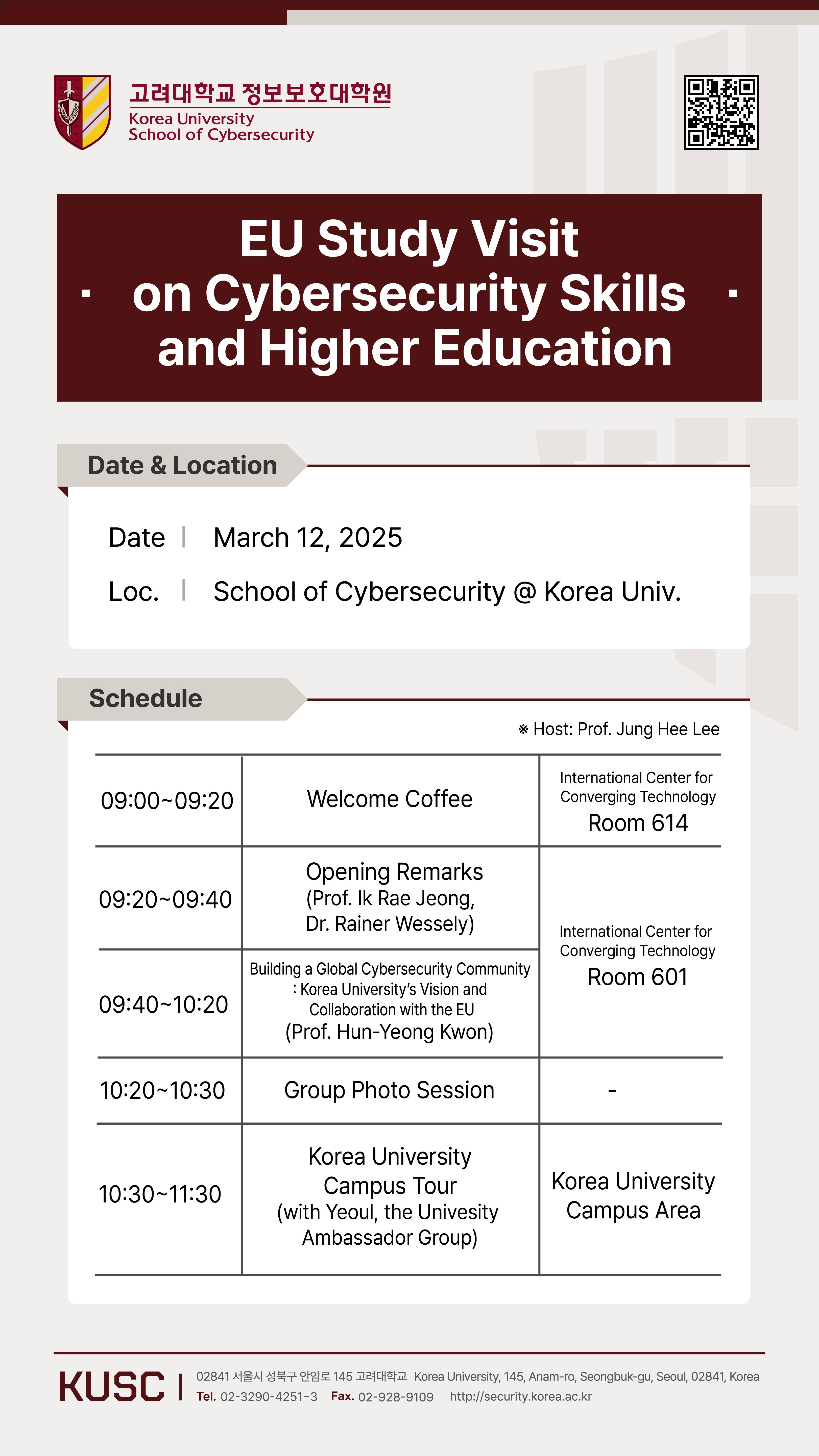 EU Study Visit on Cybersecurity Skills and Higher Education 정보보호대학원 2025-03-11 정보보호대학원 행사안내 0 1938 2025.03.11 09:51
