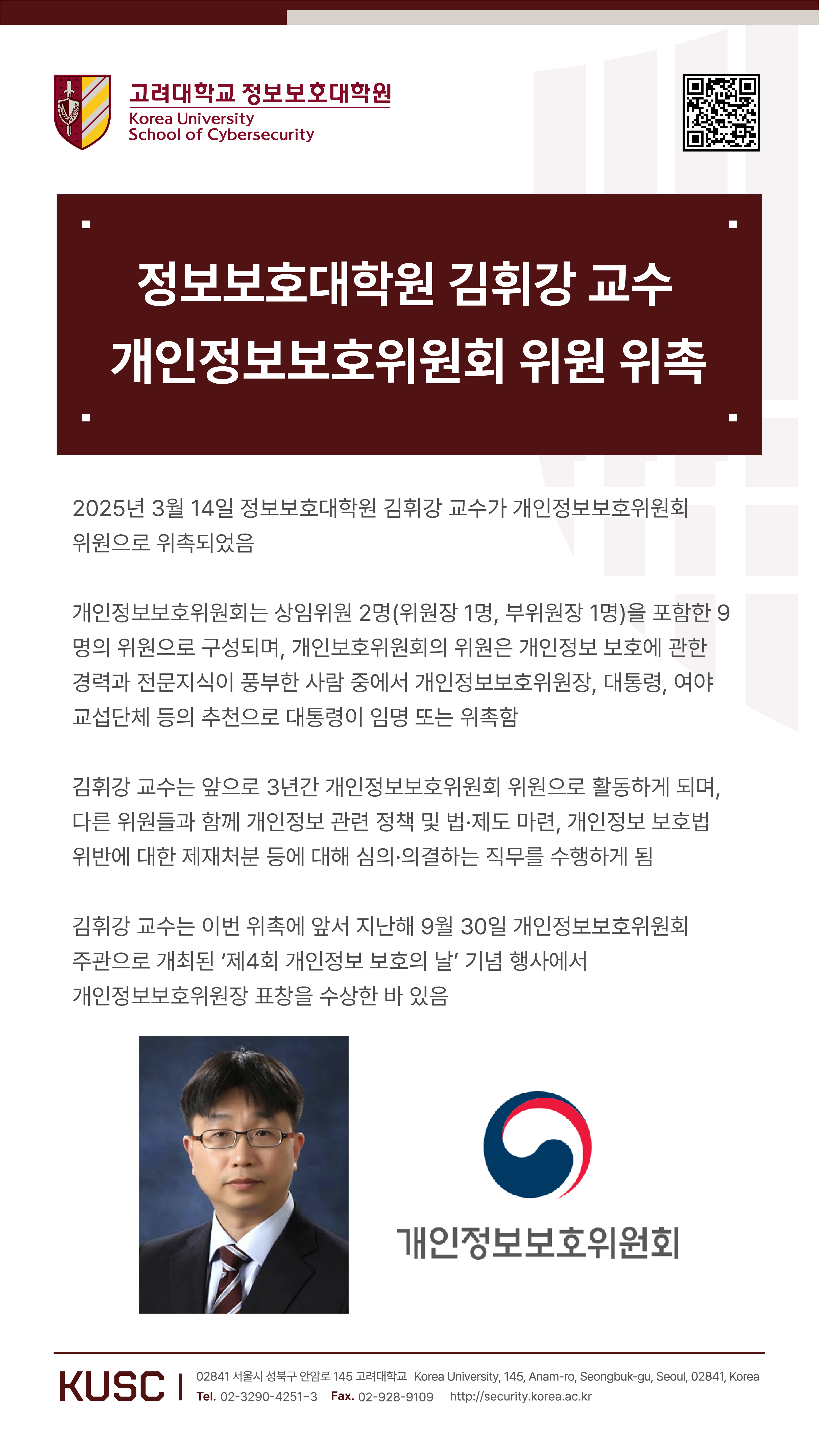 정보보호대학원 김휘강 교수, 개인정보보호위원회 위원 위촉