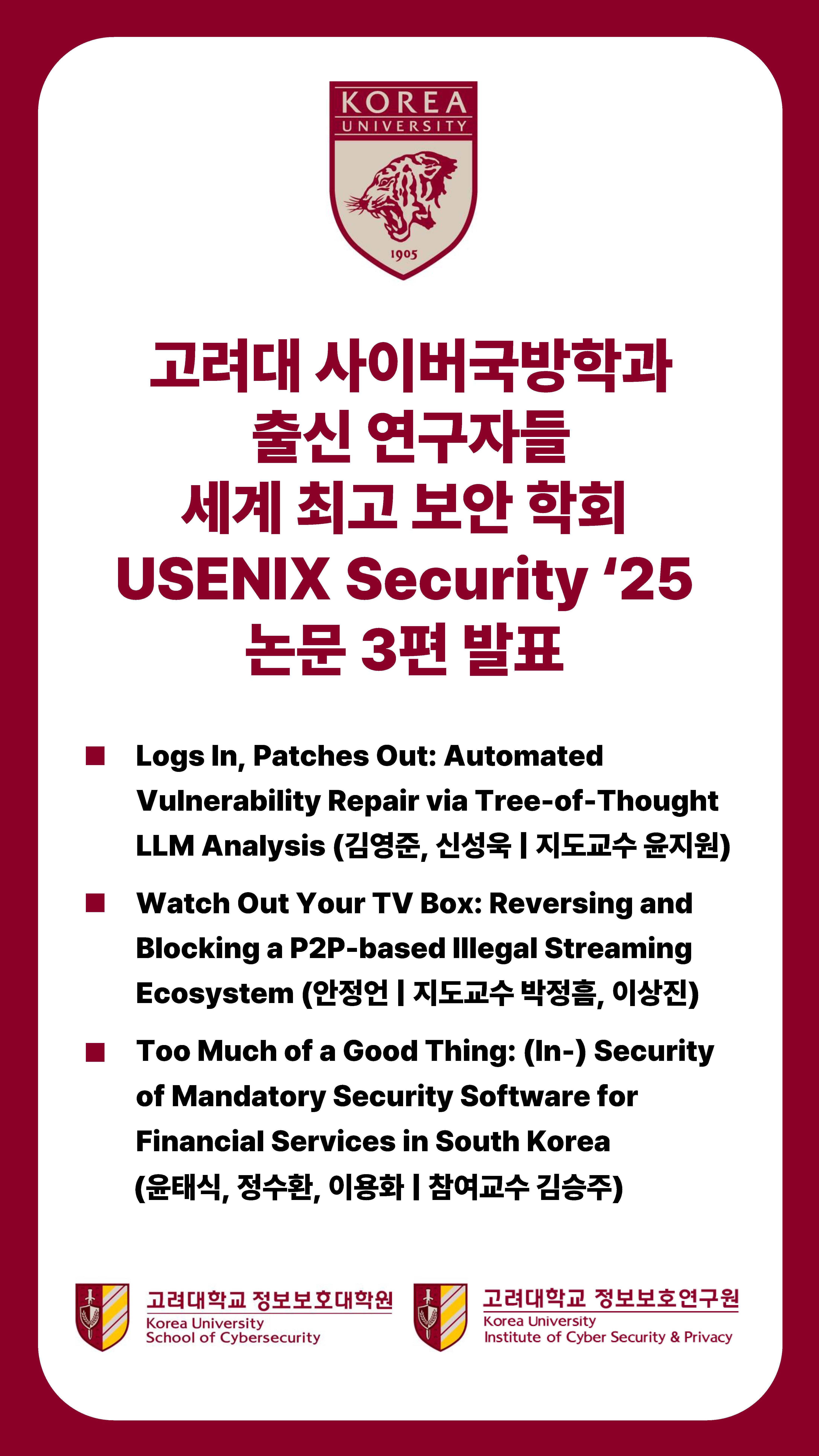 사이버국방학과 출신 연구자들 세계 최고 보안 학회 USENIX Security '25 논문 3편 발표 정보보호대학원 2025-09-12 정보보호대학원 실적소개 0 1935 2025.09.12 09:41